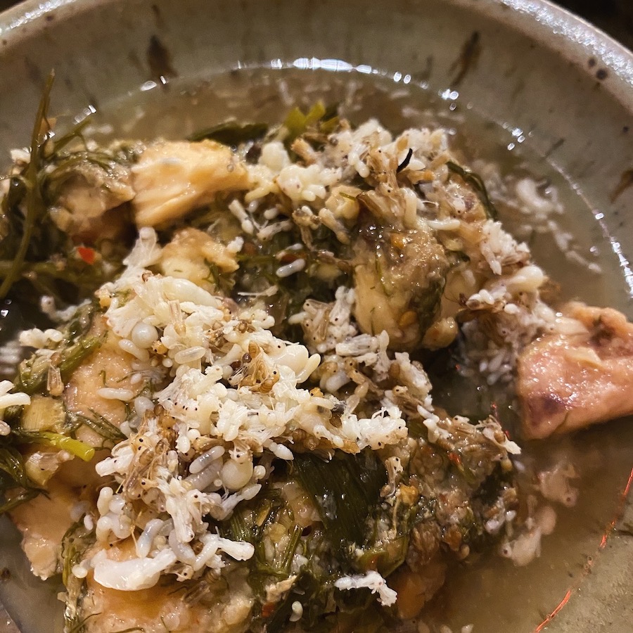 菜单上有道菜是蚂蚁卵煮鱼,想象着鱼籽的味道,毫不犹豫地点了,哎呀呀,高估了自己的尝鲜能力,原来蚂蚁蛋是幼虫。民间食物魅力的诱惑下,还是分吃了大半,剩下的小半,趁沙利文玩ipad分心时让他吃掉。味道嘛,其实就像小时候偷吃藏着蚂蚁的白糖最后那一口的味道,也像偶尔甘蔗里啃到蚂蚁的味道,总之,就是蚂蚁的味道,很独特,有点像汽油。