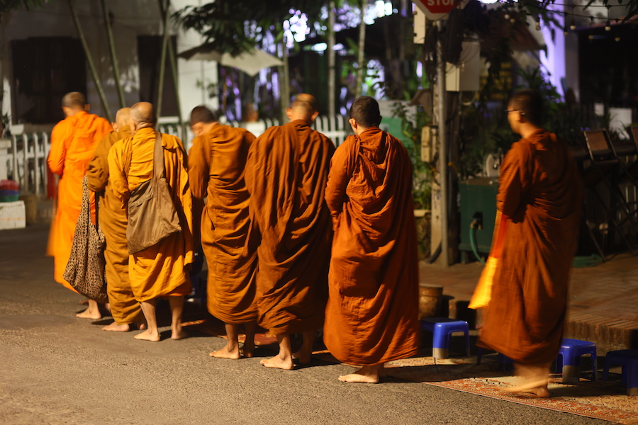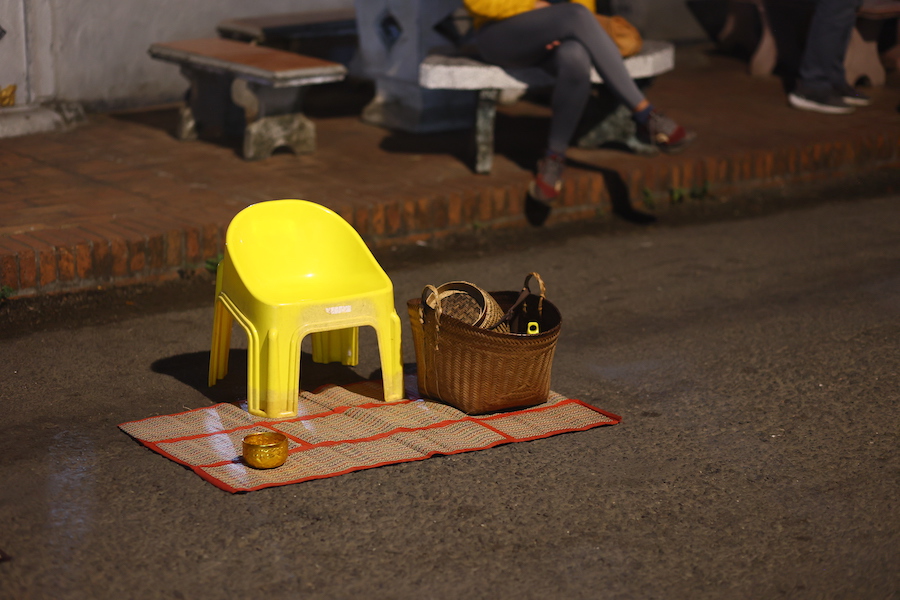 ALM布施6-7点,起床时天还未亮,两个卧床的病者,我独自下楼。六点过十多分,第一批僧人来了,比较年轻,穿着橙色僧袍,光着脚,脚步欢快,回头看看街道,似乎在琢磨,怎么那么空荡。走到布施点前,他们停留在一个篮子前,叮叮咚咚地投放东西,几团糯米饭,仿版奥利奥饼干。兜售布施品的妇女淡然地坐着,面带失望表情。寥寥几个客人,僧人们经过时,她也坐在小凳子上,分摊着自己带来的食物。