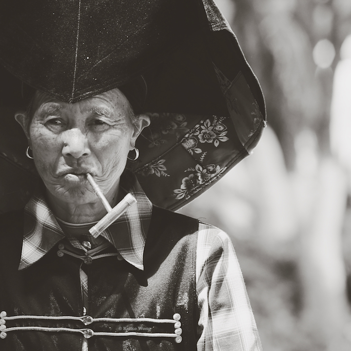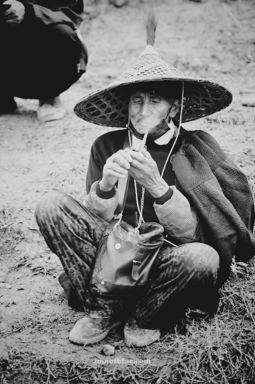 翁基,景迈山上的布朗族老村子。拐角处遇见一位优雅的女子,粉红头巾,蓝色上衣,鲜绿裙子,布满皱纹的脸,摘下耳环后花生米大的耳洞,戴着银镯子的手优雅地托着旱烟烟斗, 光着脚坐在木楼梯上。似乎能看到她少女的模样,这也许是她几十年来独处的角落。长久的钟爱和专注,是一种自在。那些愿意选择活到老的生灵,定是很强大的灵魂。